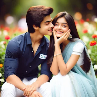 16 years old indian hot couple sitting with stylish photo soot pose in Park and looking with Romantic smile each other and boy is filling the cheek of a girl, beautiful flowers in park. boy wearing navy plain shirt, with white pant, with name "DEV" write on shirt. And girl wearing white blue saree, with name "NEHA" write on saree. they are looking so Pretty, cute, beautiful smile. Full Blaring background, high quality 4k pictures.